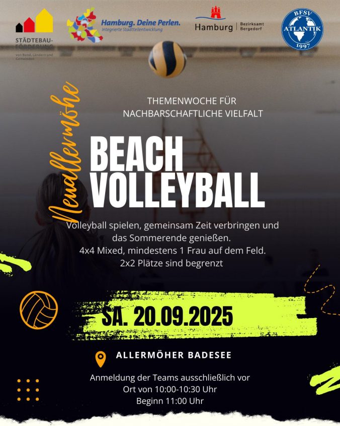 Am Samstag, den 20. September werden wir als Verein gemeinsam mit dem Stadtteilbüro Neuallermöhe und den Allermöher Beach Boys das Stadtteil-Beachvolleyballturnier 2025 ausrichten, welches dieses Jahr in die Themenwoche zur nachbarschaftlichen Vielfalt eingebunden ist. Wir hoffen auf tolles Wetter und viele Teilnehmerinnen und Teilnehmer, gern auch von außerhalb!